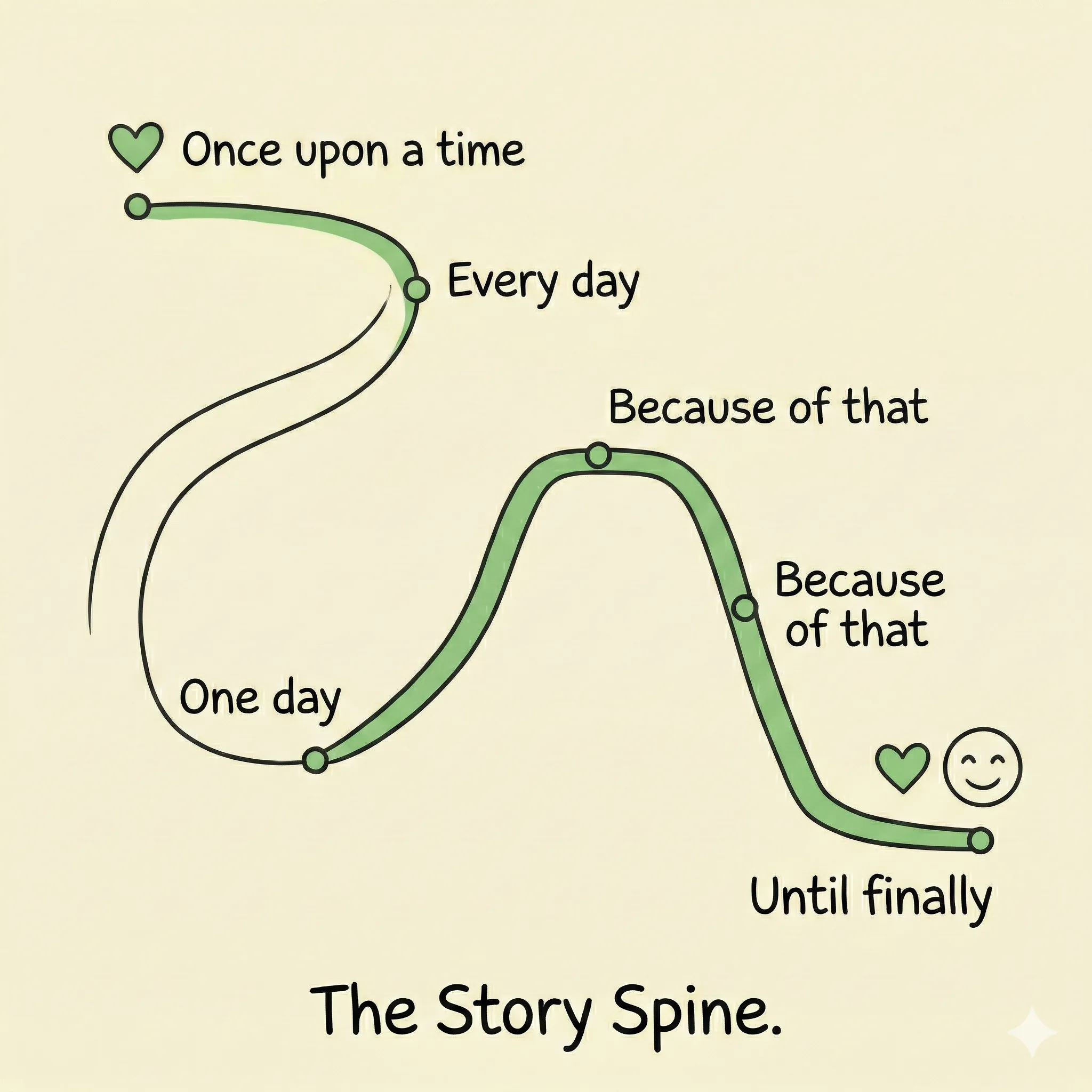 This structure does something most professional communications fail to do: it establishes what exists before it introduces what changed. Most pitches, reports, and presentations skip straight to the solution. The Story Spine forces you to build the world the audience lives in first, so that when the disruption arrives, it means something.