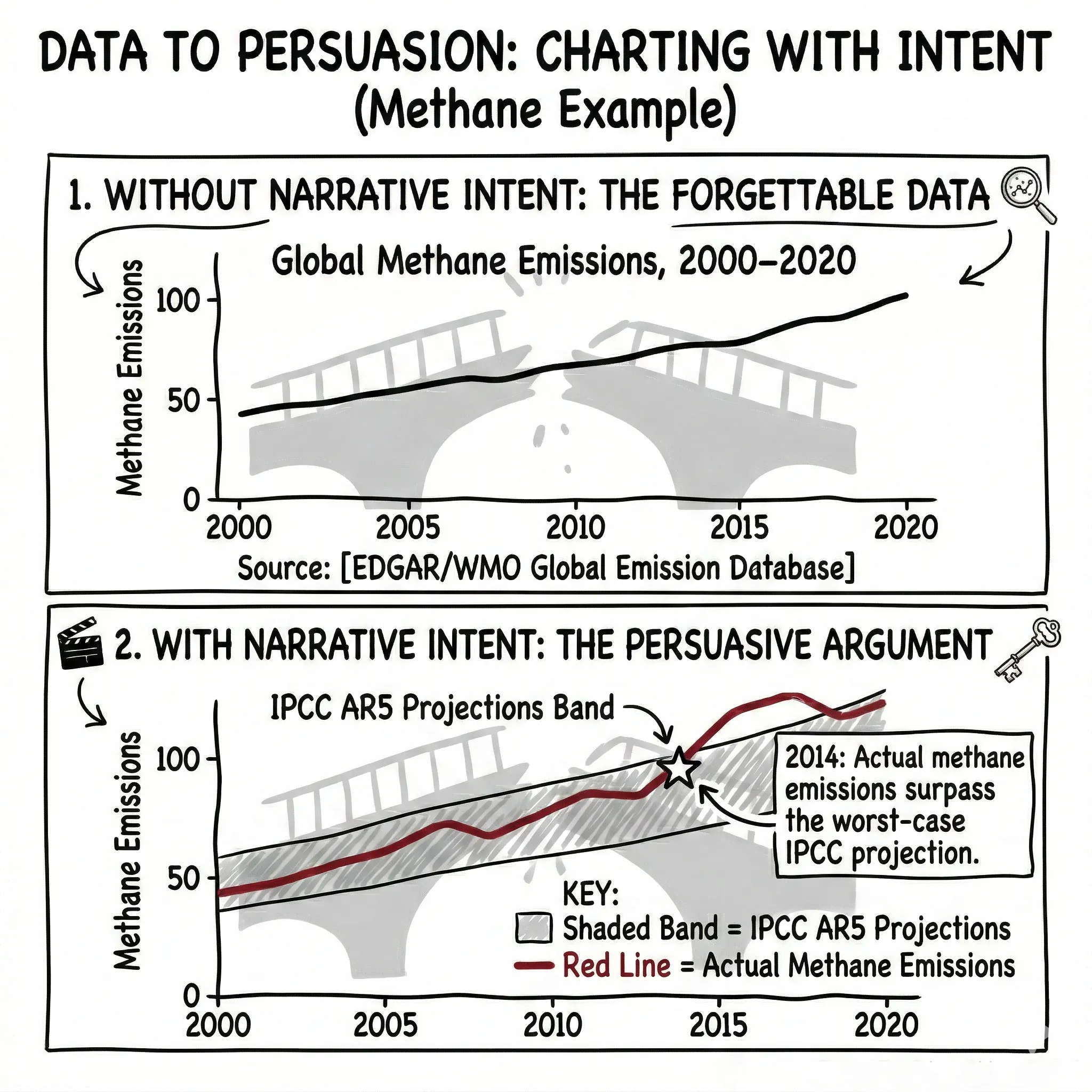 Consider these two annotations on the same emissions chart: